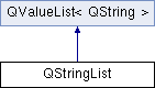 QStringList is basically a QValueList of QString objects. As opposed to QStrList, that stores pointers to characters, QStringList deals with real QString objects. It is the class of choice whenever you work with unicode strings.