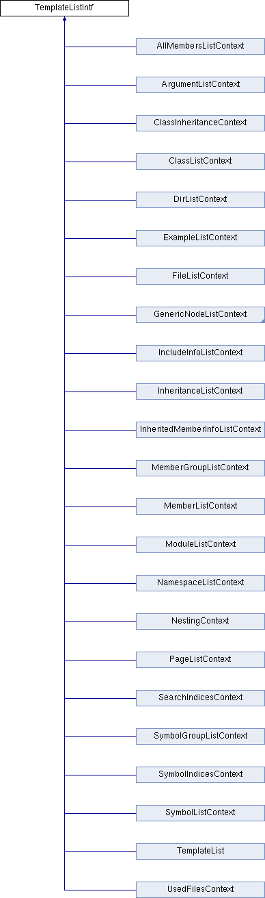 Implemented in SearchIndicesContext, SymbolIndicesContext, SymbolGroupListContext, SymbolListContext, ArgumentListContext, AllMembersListContext, InheritedMemberInfoListContext, MemberGroupListContext, MemberListContext, InheritanceListContext, ExampleListContext, ModuleListContext, PageListContext, FileListContext, DirListContext, NamespaceListContext, NestingContext, ClassInheritanceContext, ClassListContext, TemplateList, IncludeInfoListContext, UsedFilesContext, and GenericNodeListContext.