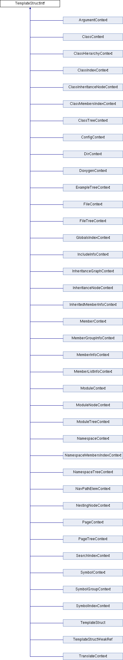 Implemented in TemplateStructWeakRef, SearchIndexContext, SymbolIndexContext, SymbolGroupContext, SymbolContext, ArgumentContext, InheritedMemberInfoContext, MemberInfoContext, MemberListInfoContext, MemberGroupInfoContext, InheritanceNodeContext, NavPathElemContext, NamespaceMembersIndexContext, ClassMembersIndexContext, GlobalsIndexContext, ExampleTreeContext, ModuleTreeContext, ModuleNodeContext, PageTreeContext, FileTreeContext, NamespaceTreeContext, ClassTreeContext, NestingNodeContext, ClassHierarchyContext, ClassInheritanceNodeContext, InheritanceGraphContext, TemplateStruct, ClassIndexContext, ModuleContext, MemberContext, PageContext, DirContext, FileContext, NamespaceContext, ClassContext, IncludeInfoContext, TranslateContext, DoxygenContext, and ConfigContext.