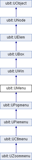 A UMenu is automatically opened when the mouse is pressed in one of its parents. Most methods are inherited from UWin. Example: