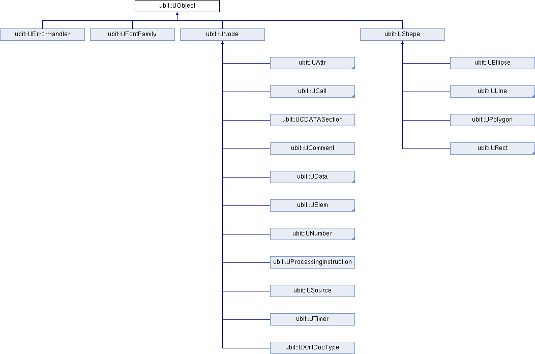 UObject is the base class for (almost) all Ubit objects. Its main subclasses are UNode, UAttr, UElem that play the same role as Node, Attribute and Element in a XML/DOM model and UBox and UWin that are the base classes for widgets and windows.