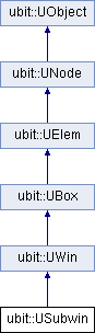 This class should not be used in most applications. It creates a non-toplevel system window (typically a X11 "child window") that is embbeded into another window. It can be useful in some specific cases (for instance for drawing GL graphics: see UGlcanvas) but should be avoided in the general case because it breaks certain graphical properties of the toolkit, such as the possibility to have transparent windows and menus (they must then be created as "hard windows", see UWin, otherwise they won't appear if they are on top of a Subwindow)